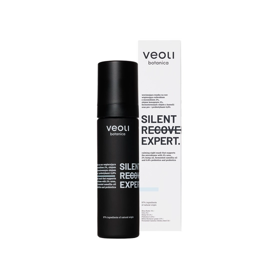 Veoli Botanica SILENT RECOVERY EXPERT – to nocna maska regenerująca, która wspiera mikrobiom i barierę hydrolipidową skóry. Mocznik, olej konopny, fermentowany olej z kamelii oraz pre- i probiotyki działają kojąco i odbudowująco. Najlepiej sprawdzi się przy cerze suchej, wrażliwej, przy cerze bardzo tłustej może być zbyt bogata na noc.